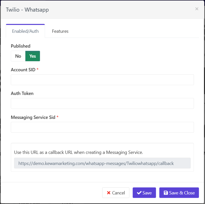 - Log in to your Twilio account and copy Account SID, Auth Token, and Twilio Phone Number. Paste them into your application’s Twilio WhatsApp plugin configuration fields.