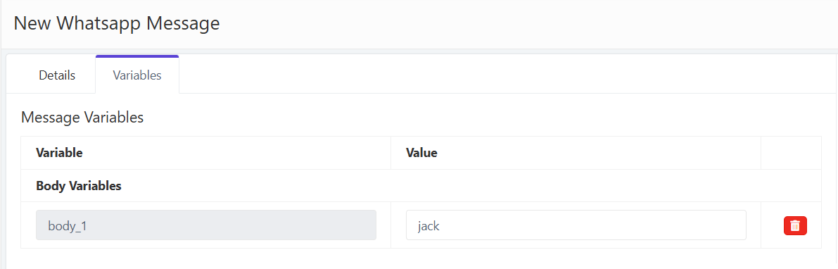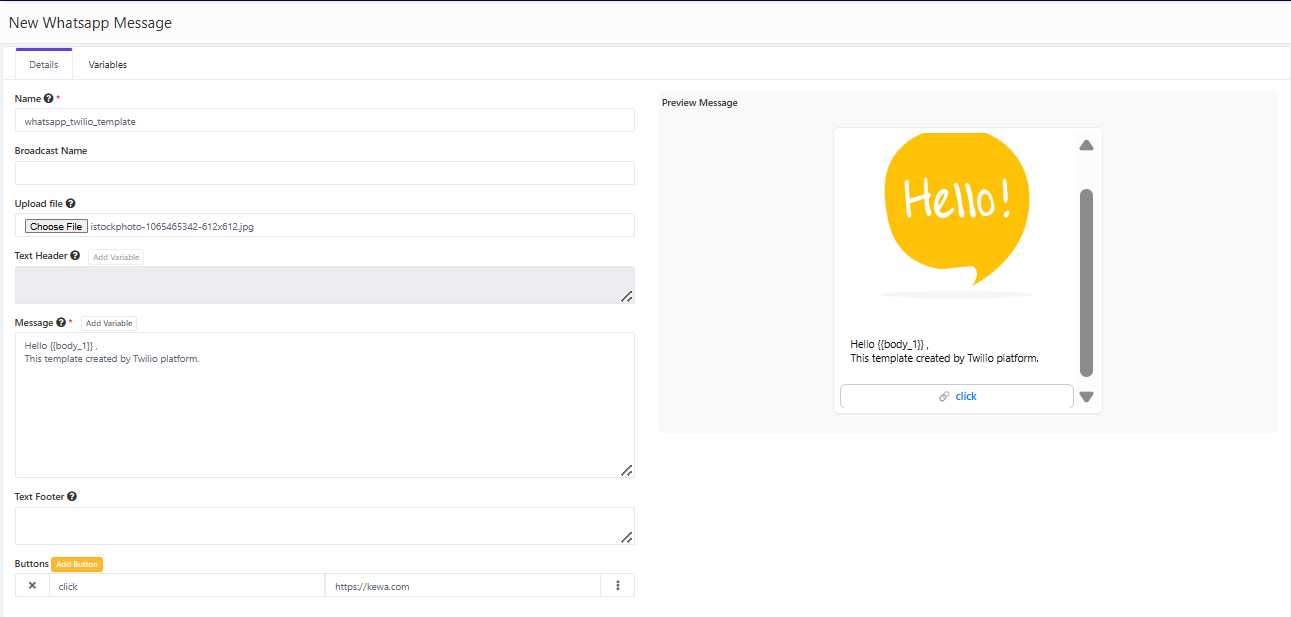 To insert variables, click the Add Variable button beside the Message heading. - In the Variables tab, you must enter valid sample data when creating the template for the first time. Later, you can use application variables such as