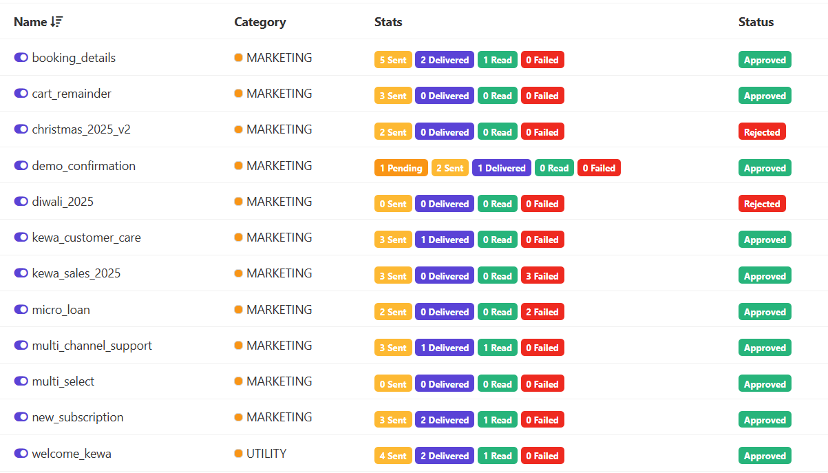 - Once approved by META, templates are immediately available for sending.